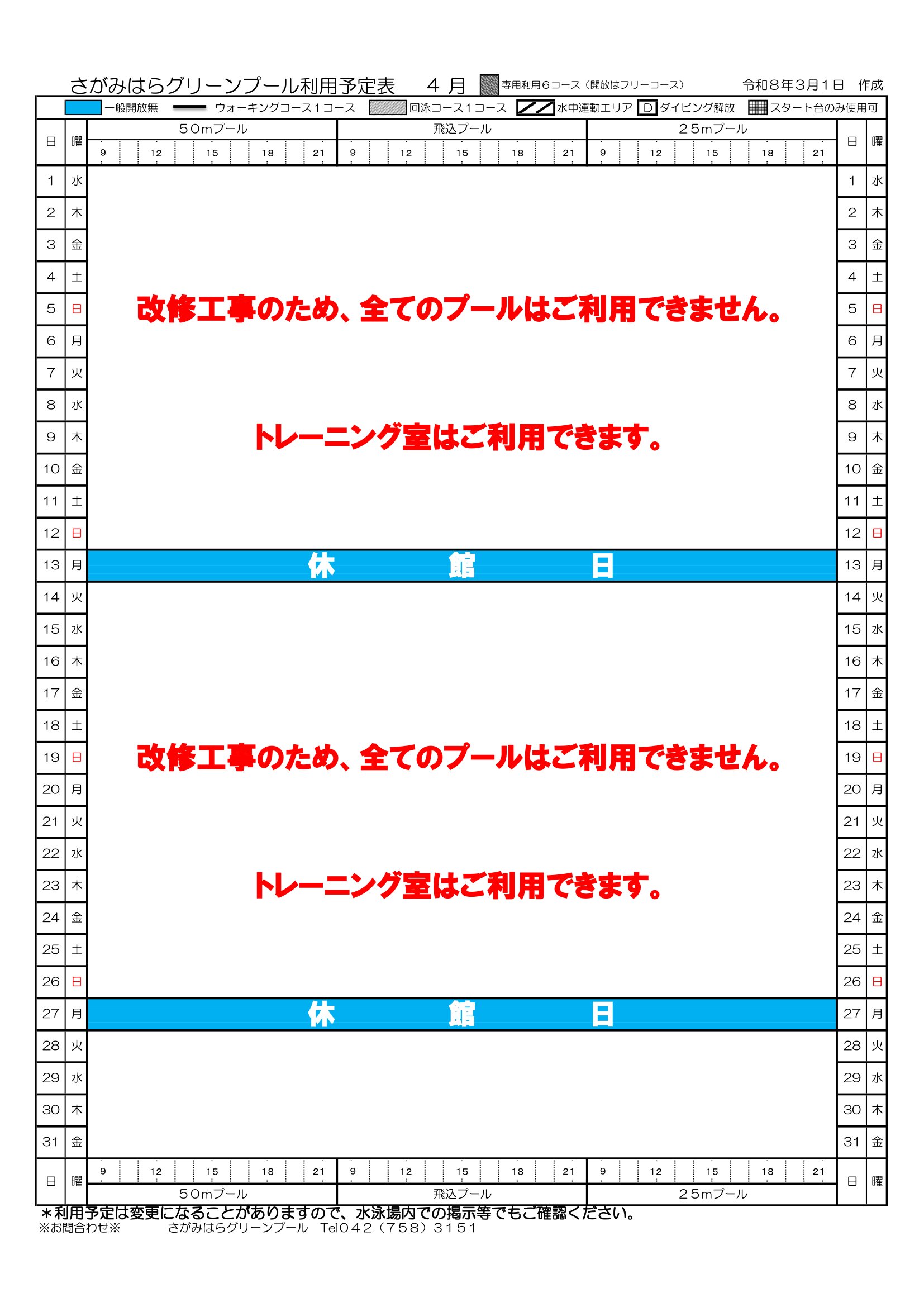 さがみはらグリーンプール予定表 令和8年 1月12月 1日作成